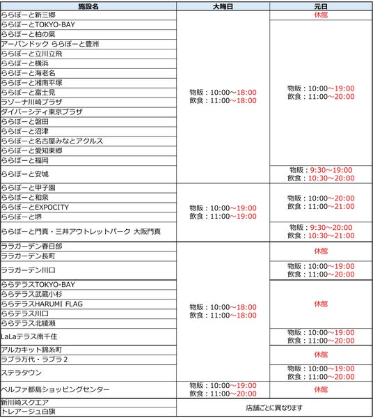 三井ショッピングパークららぽーと・ララガーデン・ららテラス・ラゾーナ川崎プラザほか計37施設では、以下の通り営業いたします。
