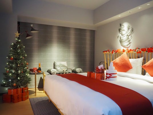 1日3室限定のクリスマスルームが登場。京都タワーを望む高層階の客室を、華やかなクリスマスカラーで彩りました。スパークリングワイン(ハーフボトル)とプチギフト付きで、朝食付き・デイユース・ディナー付きの3プランをご用意。カップルや家族旅行など、さまざまなシーンで楽しめるホリデープランです。