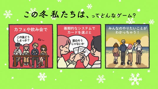 - 『これから私たちは、』が通年で遊ぶことを想定して作られているのに対し、『この冬 私たちは、』はカードの内容が冬にちなんだものばかり。冬に特化することによって、これからの季節にピッタリのゲームに仕上がりました。イベントが多く人に会うことが増える冬に遊ぶなら断然『この冬 私たちは、』がオススメです!