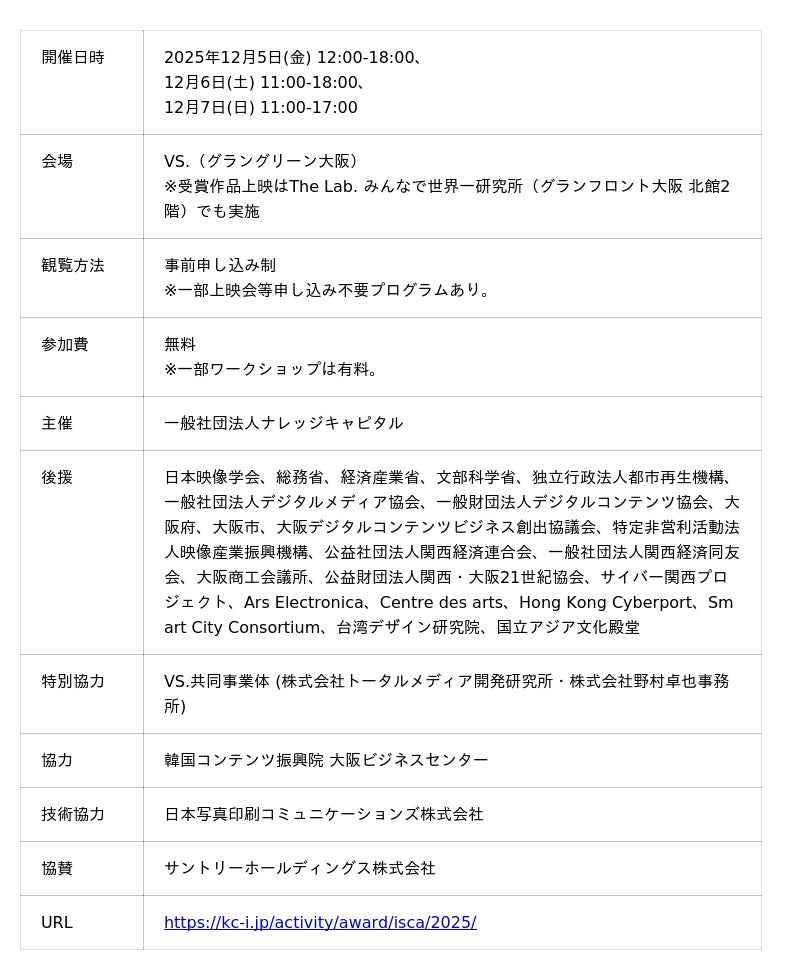 一般社団法人ナレッジキャピタル(代表理事:河口 洋一郎)ならびに株式会社KMO(代表取締役:森 秀夫)は、「ISCA2025 (INTERNATIONAL STUDENTS CREATIVE AWARD)」の受賞作品発表 上映・展示会を、2025年12月5日(金)~7日(日)の3日間、昨年グラングリーン大阪に開業した新しい文化装置VS.(ヴイエス)に舞台を移して開催します。