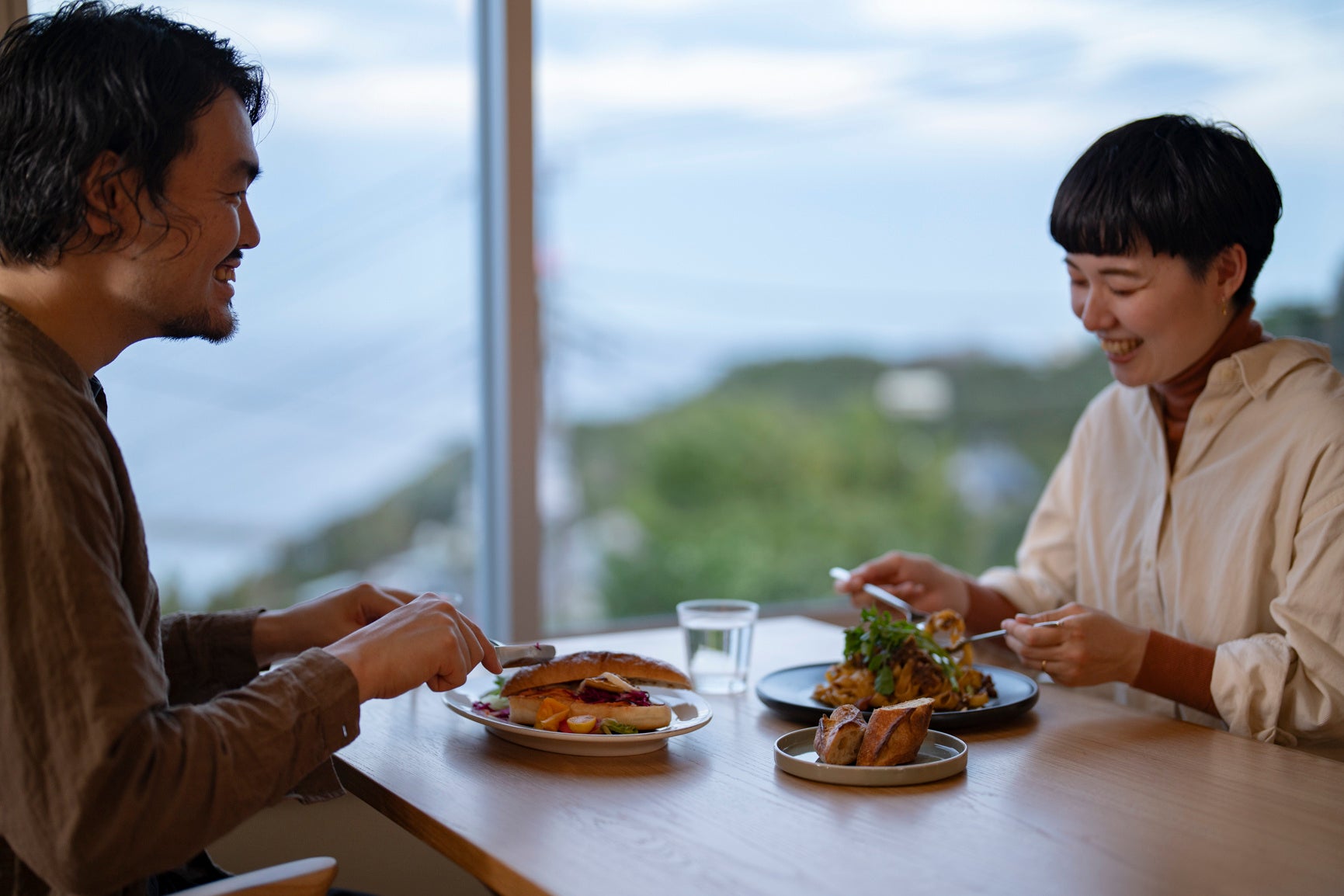 今回は、”真鶴の冬”をテーマにした『真鶴三段手帖 ―冬―』を、2025年12月3日~2026年2月28日(※一部除外日あり)まで限定でご用意。真鶴町案内読本『真鶴手帖』から着想を得た、“味わう旅”の提案として、真鶴町に引っ越してきた高校生が真鶴の民話をもとに考案した話題のスイーツ「ぼんぼん鮫最中」や、冬の柑橘・魚介・野菜など真鶴ならではの旬の味覚を取り入れたセイボリーが並びます。「CAFE&RESTAURANT燈下」は、大きな窓から海を一望できる開放的なロケーションが魅力。冬の澄んだ空気の中、真鶴の海と空が織りなす静かな景色を眺めながら、心まで温まるひとときをお楽しみください。