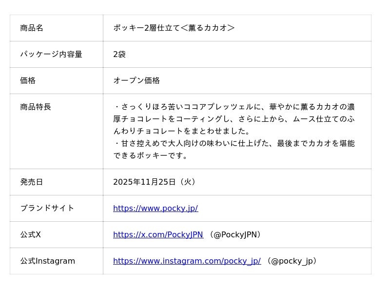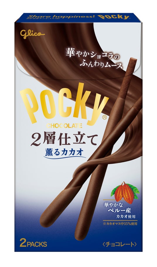 「ポッキー」は、その形状と楽しまれるシーンから「Share happiness!~分かち合うって、いいね~」をメッセージに掲げ、分け合うことで生まれるハッピーな気持ちをより多くの方に実感していただきたいと考えて活動しています。「ポッキー2層仕立て」は、2024年12月に1品目となる「ポッキー2層仕立て<バニラ香るホワイト>」を、2025年5月には2品目の「ポッキー2層仕立て<濃い渋み抹茶>」を発売し、こだわり抜いた素材とふんわりとした食感が評価され、お客様より好評いただいています。そして今回、王道のチョコレートフレーバーにて、「ポッキー2層仕立て<薫るカカオ>」を発売します。1層目はコク深いチョコレート、2層目はひと手間加えた柔らかなムースチョコレートで包み込むことで、濃厚な味わいでもすっきりとした後味に仕上げています。