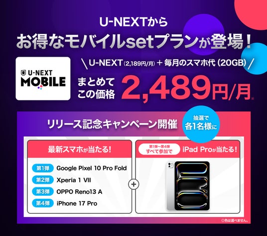 「U-NEXT MOBILE」開始を記念して、本日からモバイル端末(Google Pixel 10Pro Fold/Xperia 1 VII/OPPO Reno13 A/Apple iPhone 17 Pro)が当たるSNSキャンペーンを実施いたします。U-NEXTの公式X(https://x.com/watch_unext)から投稿される「#UNEXTMOBILEキャンペーン」をご確認のうえ、ぜひご応募ください。
