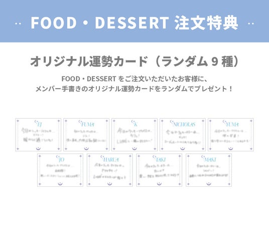 ■FOOD・DESSERT注文特典:CAFEでフードまたはデザートメニューをご注文された方に「オリジナル運勢カード(全9種)」を1品につき1枚ランダムでプレゼント。
