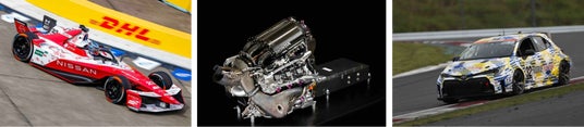 <写真:(左から)日産Formula E, Honda F1パワーユニット, トヨタ水素エンジン>