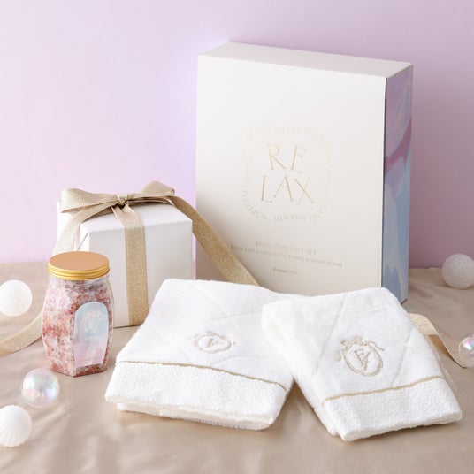まるでホテルで過ごしているような気分になれる、タオル2種とハーブ入りバスソルトのセットです。ふわりと柔らかな肌ざわりのウォッシュタオルとミニバスタオルは、ホテルタオルのようなデザインや上品な刺繍がポイント。裏面には吊り下げ用タグをあしらい、使いやすさとデザイン性を両立しました。見た目にも華やかなローズペタル入りのハーブソルトと合わせて使えば、自宅にいながらホテルのようなくつろぎのひとときをお楽しみいただけます。年末年始の疲れがたまりやすい時期に、忙しい毎日を送る友人や、頑張った自分へのご褒美にもぴったりのギフトセットです。