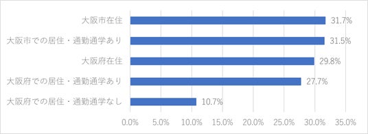 一方、居住地や通勤・通学している場所で違いをみてみると、大阪市在住の正答率が最も高く31.7%、大阪府の居住や通勤・通学の経験がない場合は10.7%と最も低くなりました。大阪府・大阪市とのかかわりの有無が正答率に影響を与えていることがわかる結果となりました。