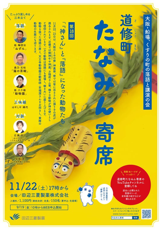 また、田辺三菱製薬が毎年神農祭にあわせて開催している「道修町たなみん寄席」の第18回は、虎をはじめとした動物がテーマの落語と、天王寺動物園の獣医師・安福潔さんや出演者の対談です。「道修町たなみん寄席」は、地域の皆さまに親しまれ、落語と講演を通して大阪の歴史や文化を学ぶ貴重な機会となっています。田辺三菱製薬は調査結果を踏まえて、道修町の認知向上と地域活性に引き続き取り組んでいきます。