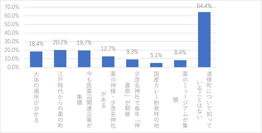 「道修町について知っていることはない」の回答が64.4%で、4年連続過去最高となりました。その他、道修町の立地がわかる割合(18.4%)、現役の「くすりの町」と認識する割合(19.7%)、「くすりの神様」を祀る少彦名神社を認識する割合(12.7%)も、2016年の調査開始以来最も低い水準となりました。一方、薬のミュージアムが集まる「道修町ミュージアムストリート」の存在を知っている割合については、8.4%と低値ではあるものの過去最高となりました。