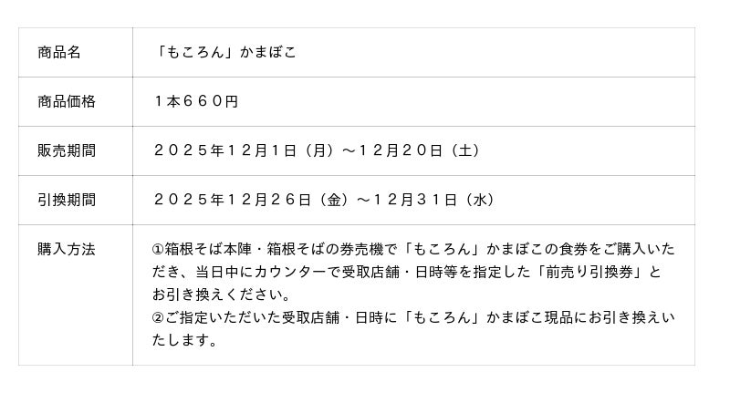 株式会社小田急レストランシステム(本社:東京都渋谷区 代表取締役社長:深海尚)は、小田急線沿線を中心に運営する『箱根そば』にて、2025年12月1日(月)から12月20日(土)まで「もころん」かまぼこの前売り引換券を数量限定※で販売いたします。お買い求めいただいた前売り引換券は、12月26日(金)から12月31日(水)までの期間に、箱根そば店舗にて「もころん」かまぼこ現品にお引き換えいただけます。ぜひ、年越そばやおせちの彩りとしてお買い求めください。