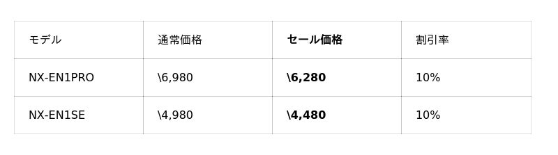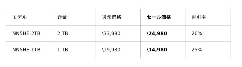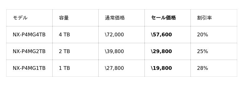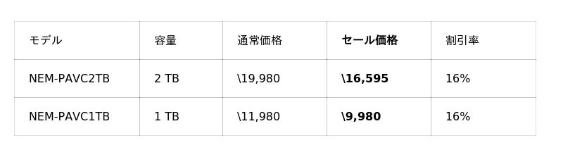 PS5動作確認済SSD NEM-PACシリーズの2TBモデルが37%OFFの¥18,500をはじめ、PS5向けSSDラインアップ全体的にお求めやすい価格となっています。また、NEM-PA系モデルがそのまま入るSSDケース NX-EN1SEもセール対象となっており、古いSSDを外付けSSDとして活用できます。PS5 SSD買い替えを検討中の方は、あわせてご検討ください。