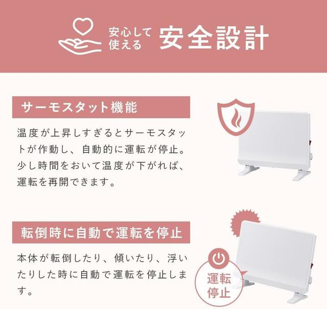 カラバリ豊富&マットな質感でインテリアとマッチ。転倒時自動オフなど安全機能も万全です