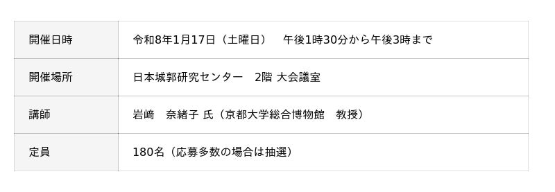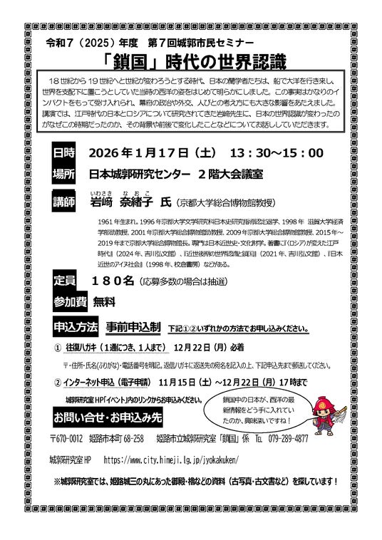 11月15日(土曜日)から12月22日(月曜日)午後5時まで城郭研究室ホームページ「イベント」内のリンクからお申込みください。
