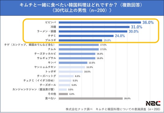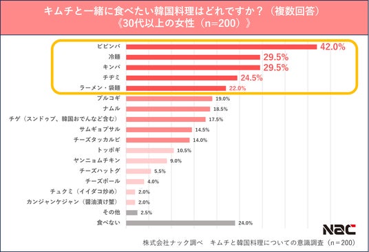 3.キムチと一緒に食べたい韓国料理も「ビビンバ」が35.6%で全体1位。20代男性には「冷麺」、 20代女性には「キンパ」が人気