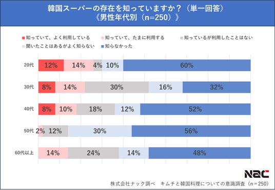 男女ともに「知っていて、よく利用している」のは20代が最多となり、若い世代が最もよく利用していることが分かりました。「知っていて、たまに利用する」も含めると利用経験はほとんどの世代で男性が多い一方、女性は男性に比べて、50~60代でも韓国スーパーを知っている人が多い結果となりました。