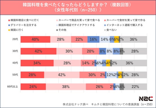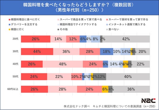世代別に見ると、男女ともに「韓国料理店に食べに行く」人は20~30代が多い一方、40代以上の世代は「スーパーで商品を買って家で食べる」「スーパーで食材を買って家で作る」人が多いことが分かります。韓国料理を食べる際は若い世代ほど外食派が多く、40代以上の世代は家で食べる人が多いことが明らかになりました。