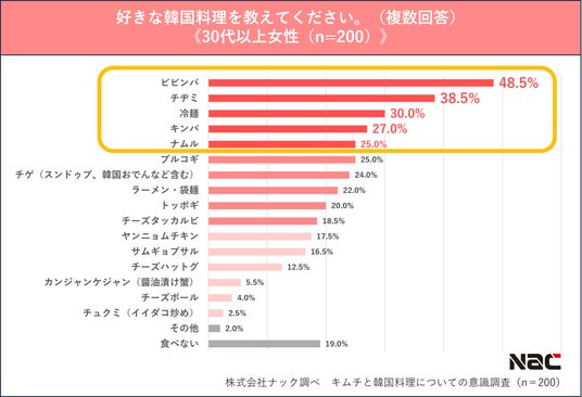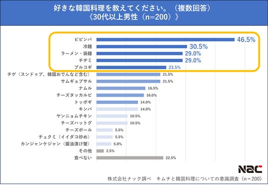 2.好きな韓国料理は「ビビンバ」が約4割を占めて全体1位。一方、20代は「ヤンニョムチキン」が1位となり、他の世代と異なる結果に