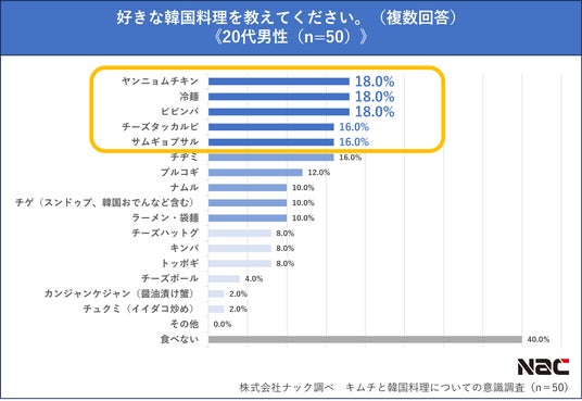 好きな韓国料理を選択肢からすべて選んでもらったところ、全体では「ビビンバ」が42.8%で1位となりました。一方、世代別に見ると、30代以上は男女ともに全体の傾向と似ていたのに対し、20代女性は「ヤンニョムチキン」「チーズタッカルビ」が34.0%で同率1位、20代男性は「ヤンニョムチキン」「冷麺」「ビビンバ」が18.0%で同率1位となり、20代のみほかの世代と異なる傾向が見られました。