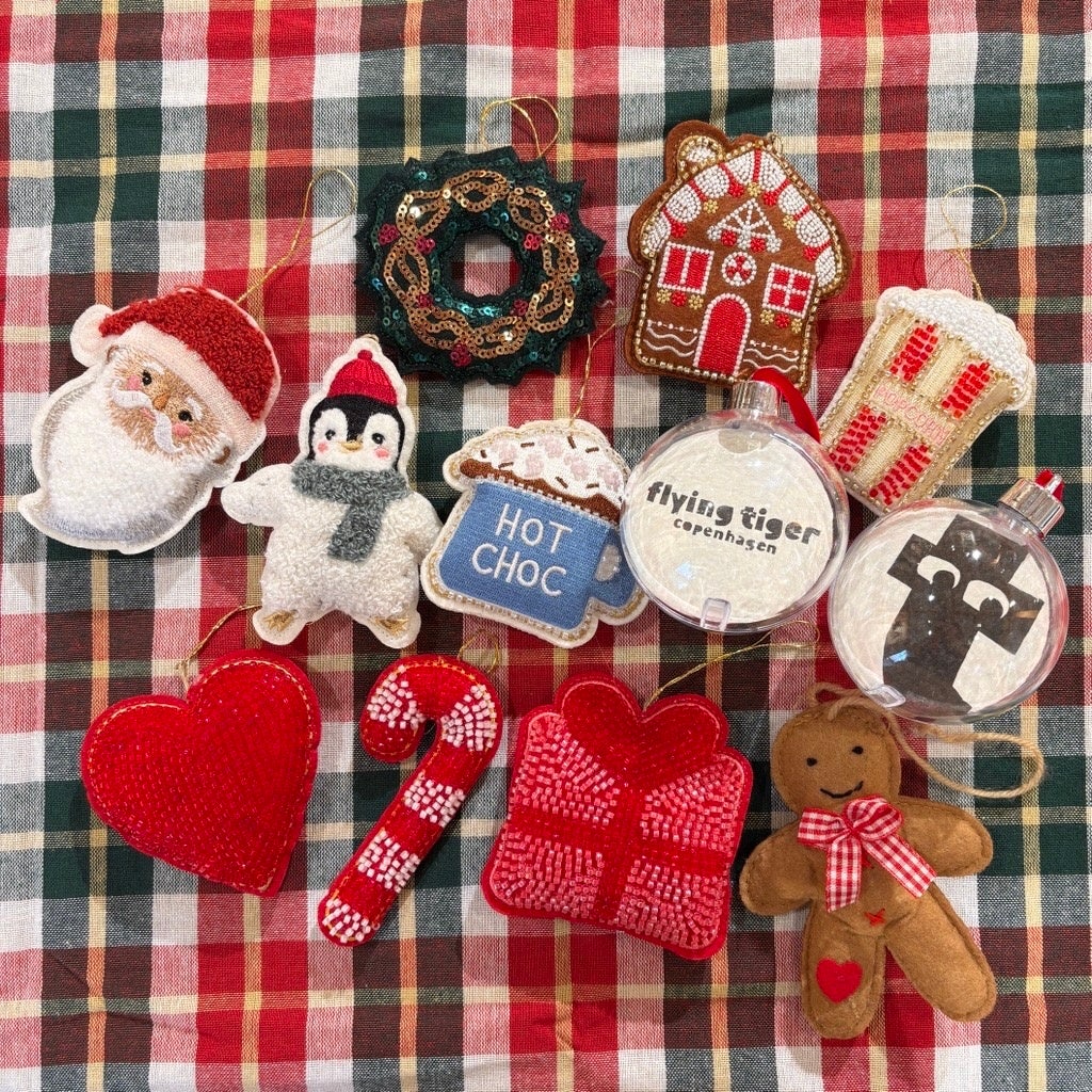 ビーズやフェルトの、"割れない" オーナメント12個のセット。フライングタイガーではガラスのオーナメントが定番ですが、「子どもやペットがいるおうちでも、安心して使えるオーナメントがほしい」という声にお応えしました。