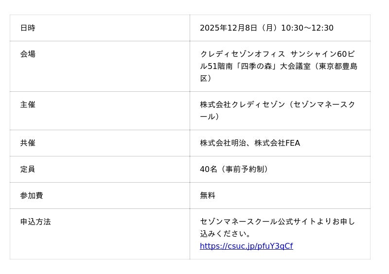 株式会社クレディセゾン(本社:東京都豊島区、代表取締役(兼)社長執行役員:水野 克己、以下:クレディセゾン)が運営するセゾンマネースクールは、株式会社明治(本社:東京都中央区、代表取締役社長:八尾 文二郎、以下:明治)と共同で、「食育×マネ育」をテーマにしたコラボセミナー第2弾を2025年12月8日(月)に開催します。