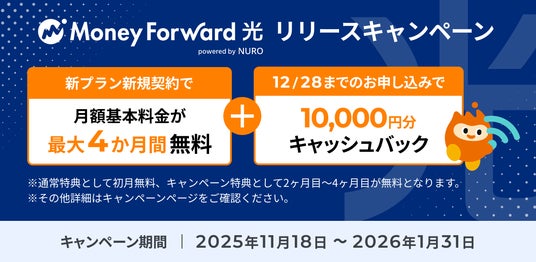 - 「マネーフォワード光 powered by NURO」の初月の月額基本料金が無料になります。
