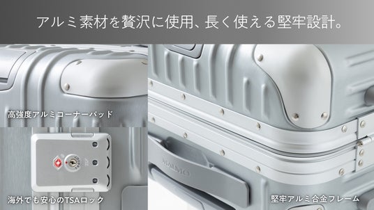 【アルミ×ポリカーボネート構造で、強さと美しさを両立】刃物にも強く、雨にも負けないアルミ合金フレームと、軽量でしなやかなドイツ製ポリカーボネートを融合。壊れやすい四隅にはアルミコーナーパッドを配置し、外圧400kgにも耐える圧倒的な剛性を実現しました。2ヶ所のTSAロック(暗証番号式)により、鍵をかけたまま荷物を預けられる安心仕様。旅先でもビジネスでも、洗練された存在感で荷物を守る、プレミアムモデルです。