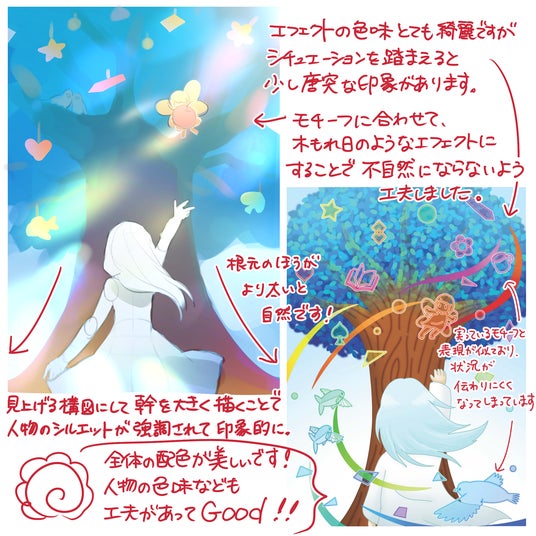 講師陣からの提出作品、課題への個別添削の一例。良い点と改善点などがきめ細かく書き込まれている。