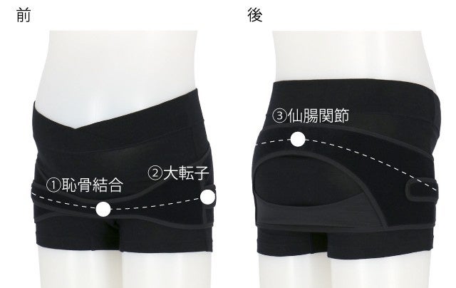 骨盤まわりの3つのポイント(仙腸関節~大転子~恥骨結合)を環状にサポートし、仕事や育児などで動いてもズレにくい設計です。