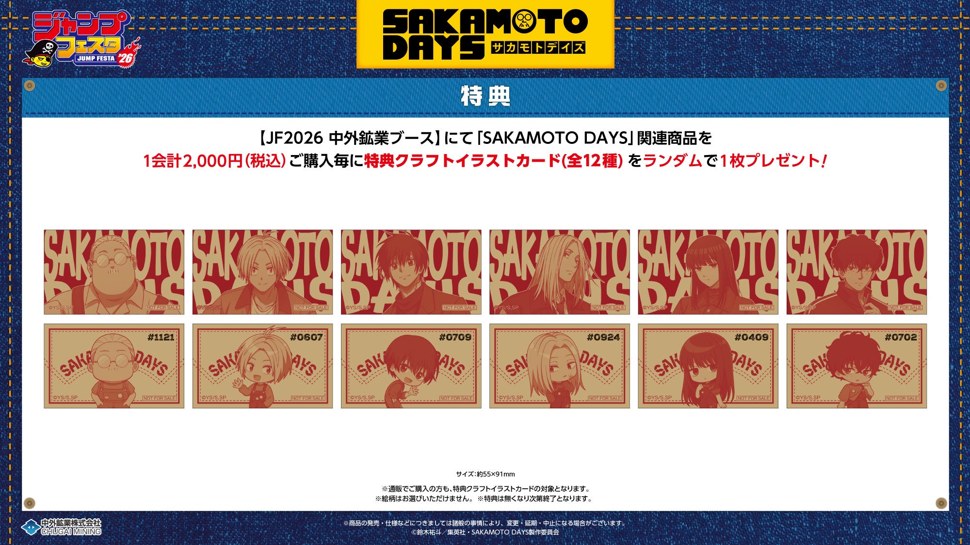 中外鉱業ブースにてTVアニメ『SAKAMOTO DAYS』JF2026関連商品を1会計2,000円(税込)ご購入毎に、特典クラフトイラストカード(全12種)をランダムで1枚お渡しいたします!