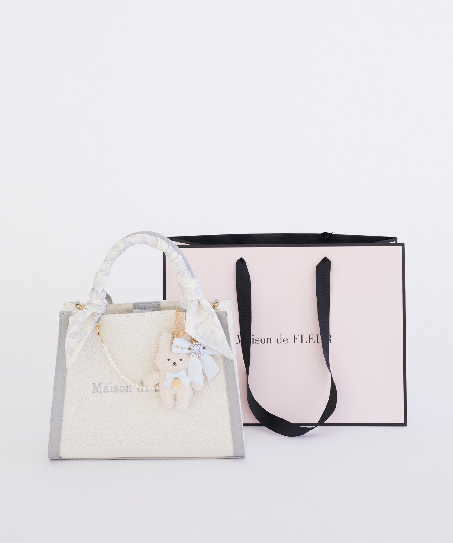 コンビバッグは、フロントにMaison de FLEURのロゴを刺繍であしらい、どんな装いにも自然に馴染むシンプルなデザインです。セットのスカーフは、カラーごとに異なるデザインで、リボンや花柄、モノグラム柄を採用しました。バッグのハンドルに結んだり、ヘアアクセサリーとしても活躍してくれるアイテムです。