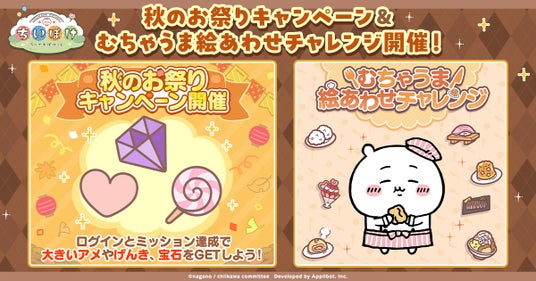 株式会社アプリボット(本社:東京都渋谷区、代表取締役社長:浮田光樹)が企画・制作・開発・運営を行う、スマホアプリ『ちいかわぽけっと』(以下、『ちいぽけ』)は、2025年11月18日(火)より3つの「秋のお祭り」キャンペーンを実施することをお知らせいたします。また、『ちいぽけ』公式Xにて、キャンペーンに合わせたチャレンジ企画も実施いたします。