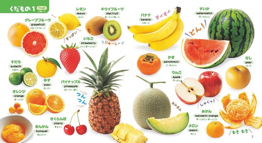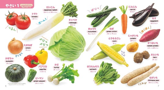 「きょうはなにたべようか?」。おいしそうな食べ物の写真を指差ししながら、子どもと一緒に楽しめる図鑑です。「あまーい」「すっぱい」「しゃくしゃく」など食べ物に関係する言葉もいっぱい。食べ物の名前と一緒に声に出して、楽しめます。またネイティブの発音に近い読み仮名つきの英語表記も掲載しています。