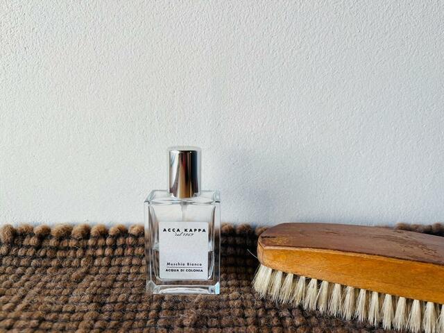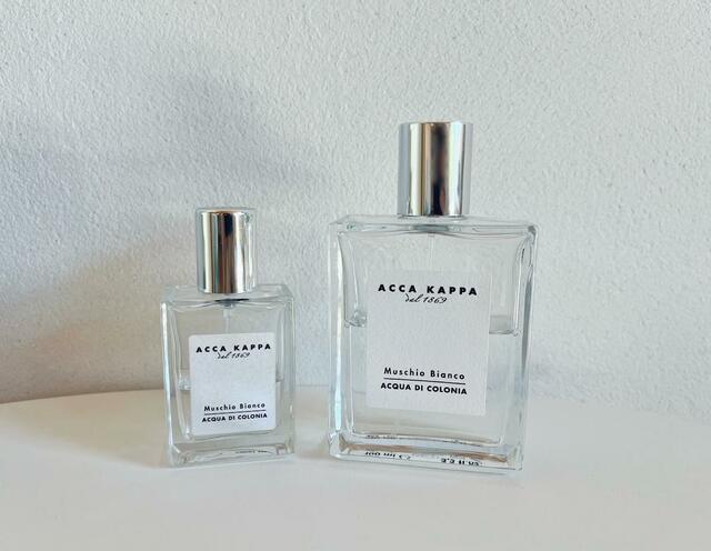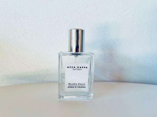 シンプルなブロック体印刷が美しいこちらの透明瓶は、アッカカッパの「ホワイトモス オーデコロン」。アッカカッパは150年の歴史を持つイタリアのボディケアメーカーです。