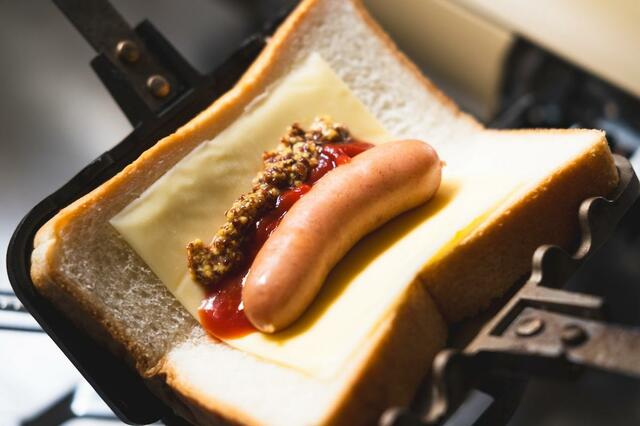 ウインナーを茹で終わったら、あとはチーズ・ケチャップ・マスタードと一緒に乗せて、両面を2分ずつくらい焼いたら完成です!