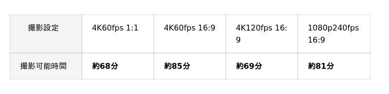 ※25℃の室温環境下で、RockSteadyオン、Wi-Fiオフ、音声操作とジェスチャー操作オフ、画面オフの状態で、1080p/24fps (16:9) 動画撮影時に測定。データは、管理された環境下にて収集されたものであり、参考値です。