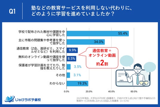 じゅけラボ予備校(所在地:大阪市北区、代表取締役:後藤智則)はこの度、現在大学生のお子様を持つ保護者のうち、大学入試に際して塾や予備校などの教育サービスを利用しなかったと回答した574名を対象に、その学習方法に関するアンケートを実施いたしました。