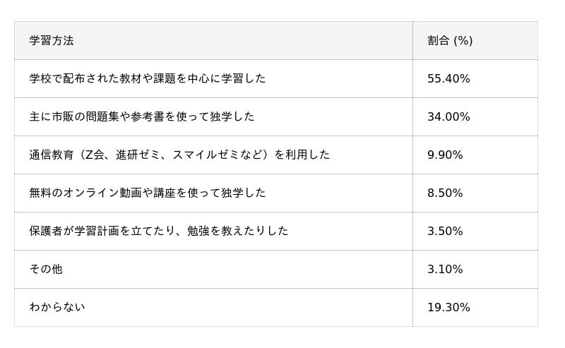 今回の調査で最も注目すべきは、塾や予備校を利用しなかった家庭の学習方法として、実に55.4%が「学校で配布された教材や課題を中心に学習した」と回答した点です。これは、2人に1人以上が「学校の学びだけで大学受験に対応できる」と判断していることを意味します。