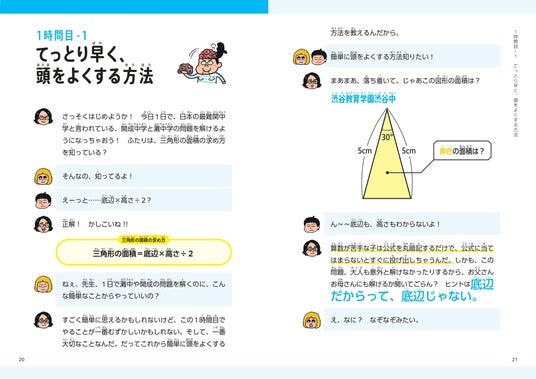 本書は、数々の図形問題を会話形式でテンポよく、大きな文字で読みやすく、フルカラー&イラスト満載で解説。「三角形の面積」といった基礎から解説するので、算数が苦手な人でも大丈夫。たった1日で、灘や開成の入試問題が気持ちよく解け、読み終える頃には、図形問題を解くために必要な「4つの武器」が身につきます。