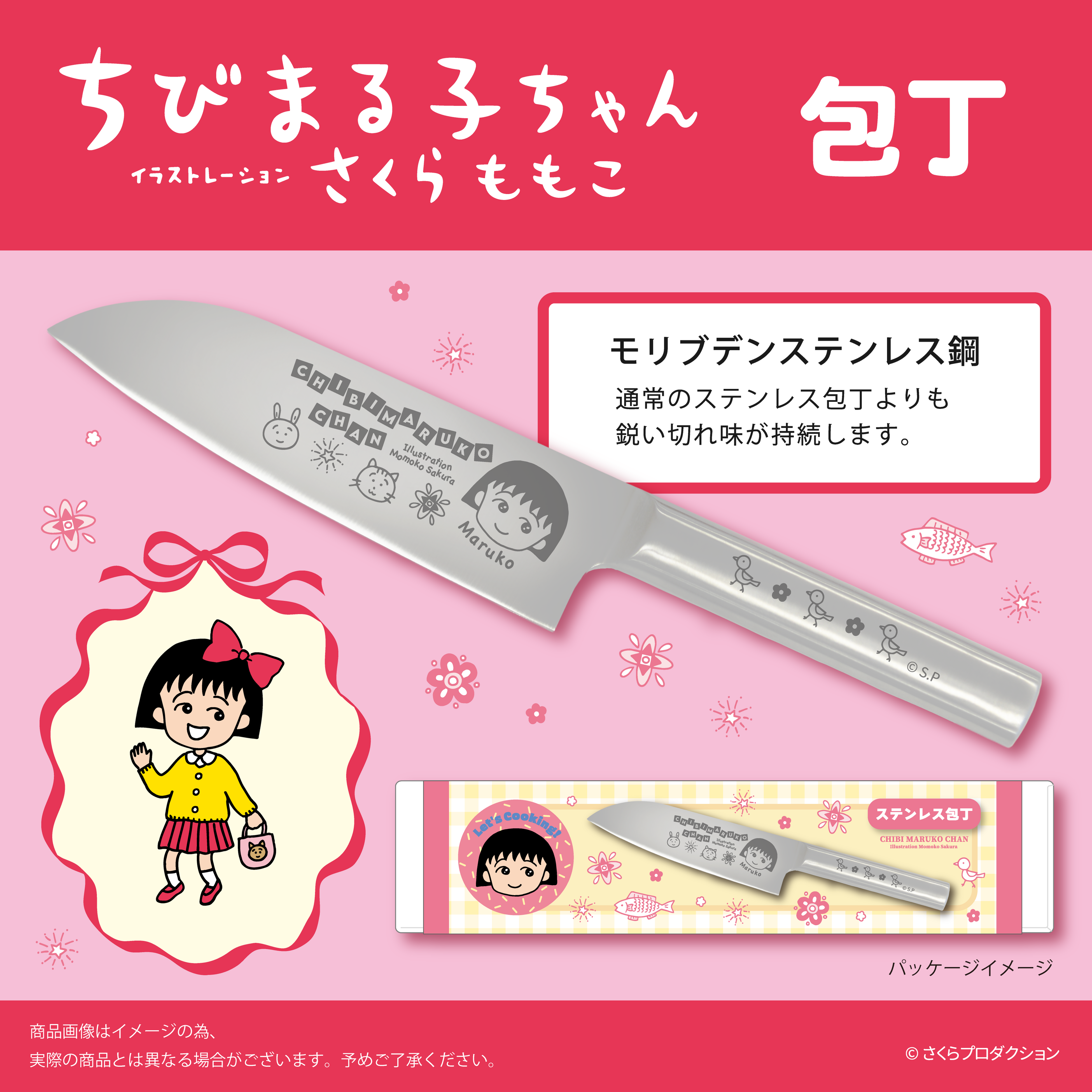かわいいまるちゃんのイラストがレーザー焼き付けされた三徳包丁。