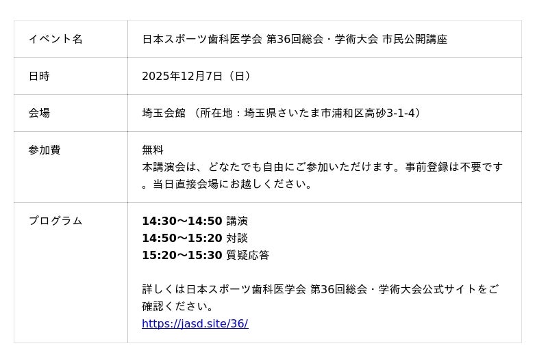 株式会社ヨシダ(本社:東京都台東区、代表取締役社長:山中 一剛)は、2025年12月7日(日)に埼玉会館(さいたま市)で開催される日本スポーツ歯科医学会 第36回総会・学術大会において、市民公開講座に登壇することをお知らせいたします。