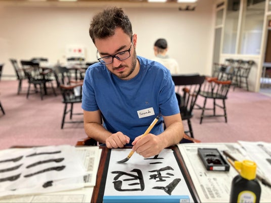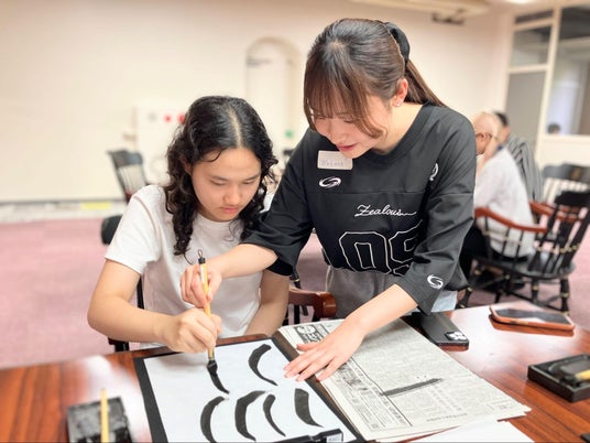 10月22日(水)に、留学生を対象とした書道体験イベントが開催されました。日本文化への理解を深めながら異文化交流を促す目的で行われた本イベントには、多くの留学生が参加しました。参加者は書道の歴史や基本の筆遣いを学び、自らの作品制作に取り組みました。当日は日本人学生も参加し、筆の持ち方や文字の書き方を丁寧に指導する姿が見られ、言葉や文化の垣根を超えた交流が広がっていました。