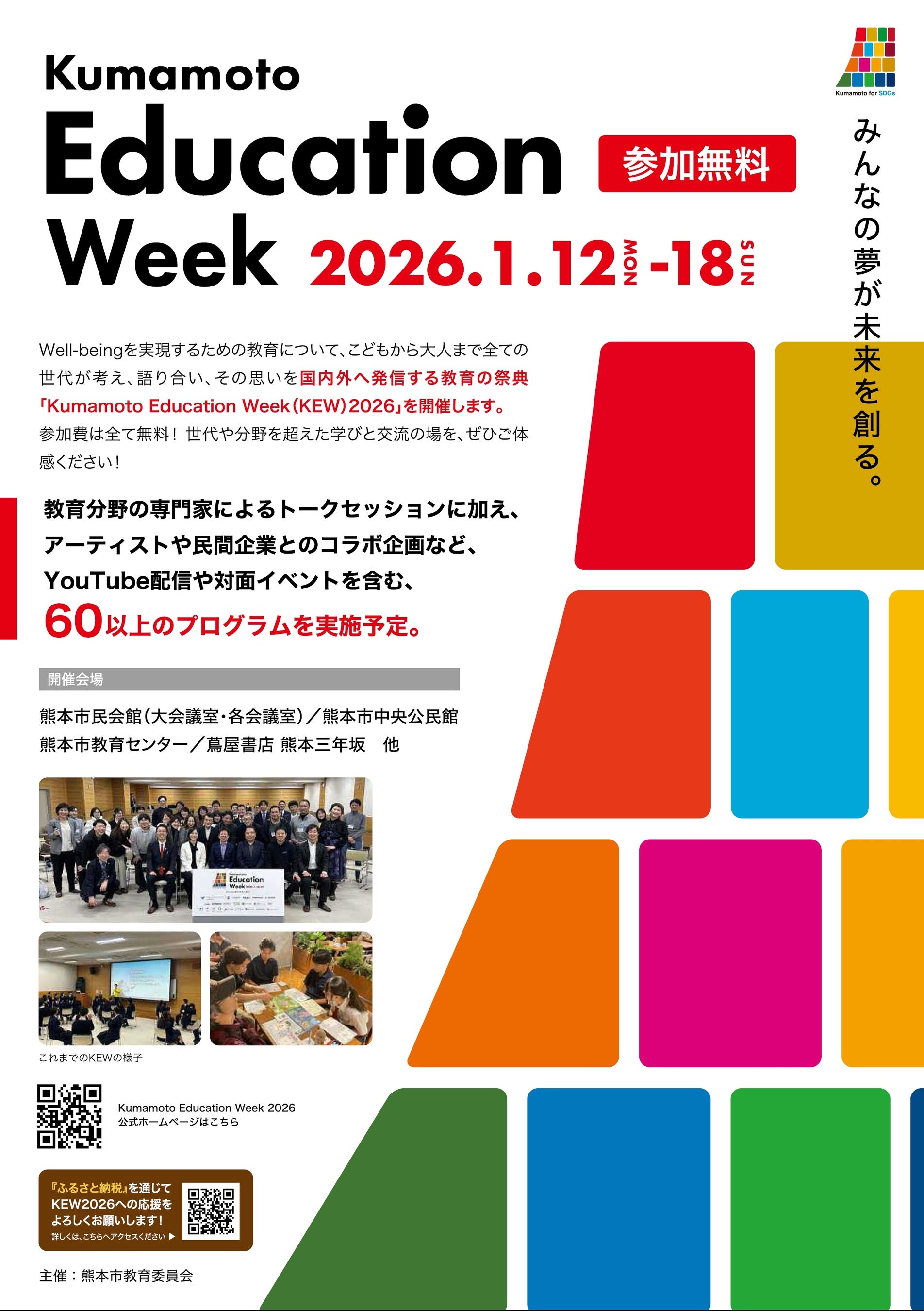 この取組のひとつである「Kumamoto Education Week(KEW)」は、Well-beingを実現するための教育について、多様な社会の参加者と共に考え、世界の教育振興に貢献し、「みんなの夢が未来を創る」をテーマとして2020年からスタートし、今年度で6回目の開催となります。