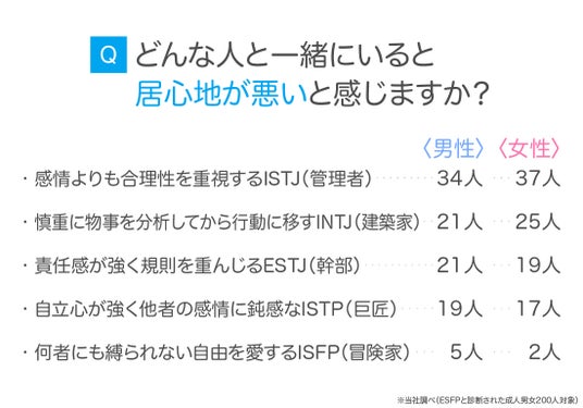 ESFP(エンターテイナー)と診断された成人男女200人に、どんな人と一緒にいると居心地が悪いか尋ねてみました。