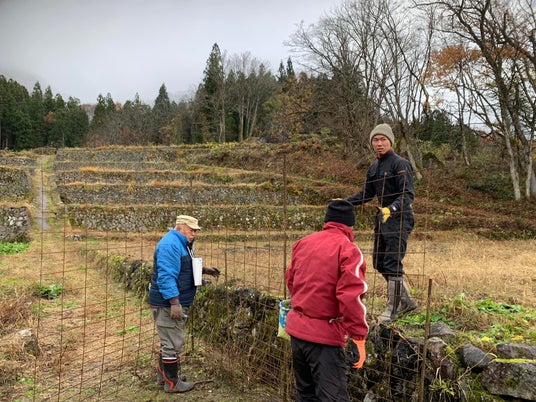 ・種蔵地区で最も石積み棚田の景観が楽しめる最上段の棚田に設置してある金網の獣害防止柵を撤去します。(種蔵地区は3mを超える雪が降るため、破損を防ぎます)