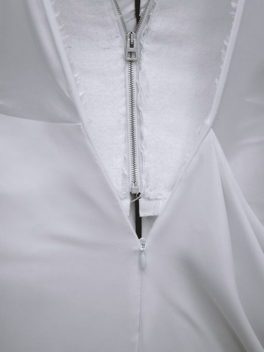 ジェニファー・ローレンスはホワイトとアイボリーのドレープシルクドレスを纏いました。