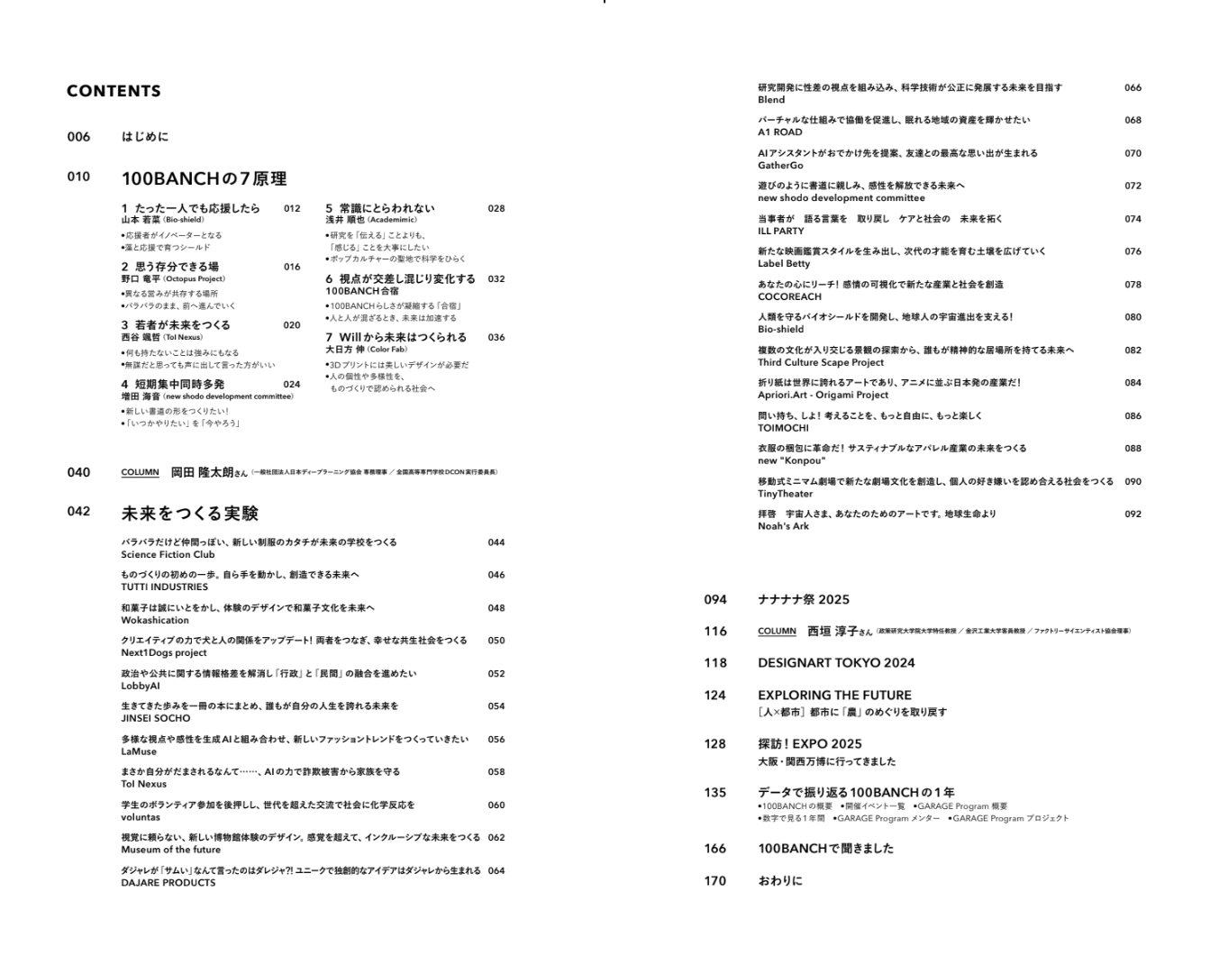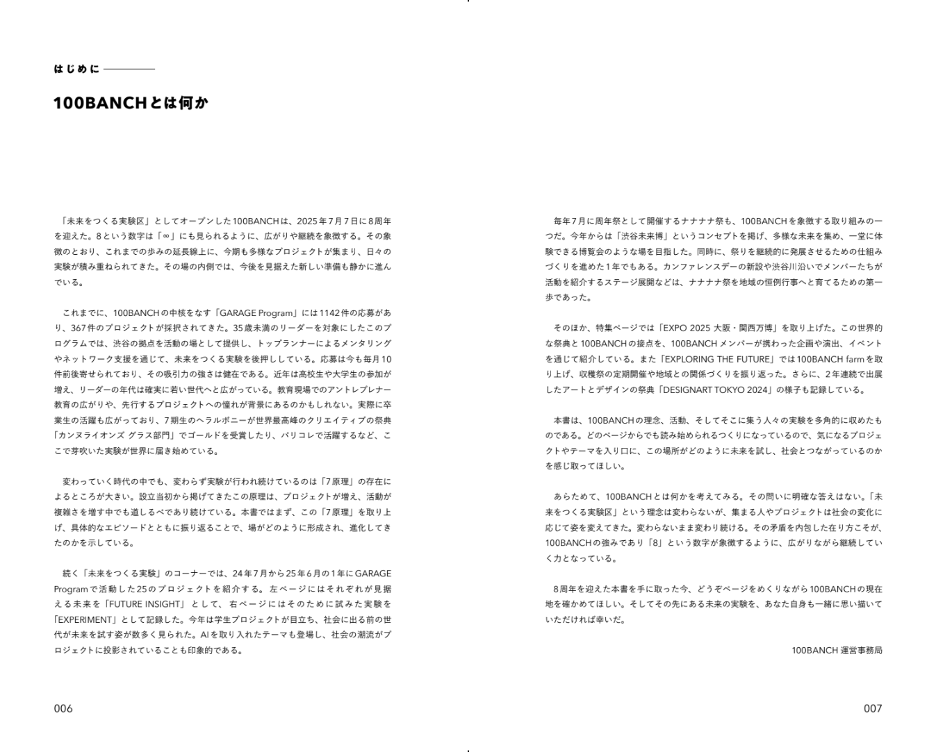 本書は、8年目にあたる2024年7月~2025年7月までの活動を収録。100BANCHの運営に欠かせない場の根本と視座を定めた7つの原理が実体化したエピソードを紹介する「100BANCHの7原理」をはじめ、日々「未来をつくる実験」に取り組む GARAGE Programの採択プロジェクトの中から25プロジェクトを紹介した「未来の実験」を掲載。