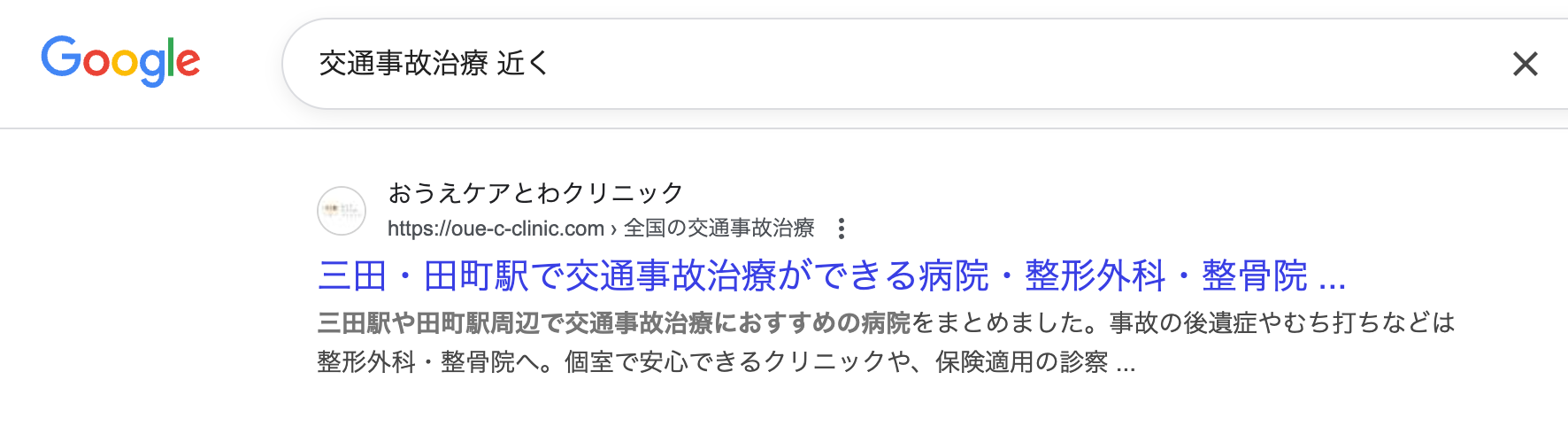 ユーザーが事故後に検索するキーワードを分析し、「交通事故治療 近く」「交通事故治療 整骨院」「交通事故治療 整形外科」