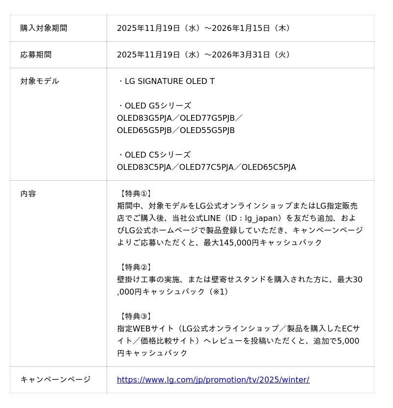 本キャンペーンでは、期間中にLG公式オンラインショップまたはLG指定販売店で対象モデルをご購入後、当社公式LINE(ID:@lg_japan)を友だち追加、およびLG公式ホームページで製品登録し、キャンペーンページからご応募いただくと、最大145,000円をキャッシュバックします。加えて、壁掛け工事の実施、または壁寄せスタンドをご購入いただいたお客様には、最大30,000円をキャッシュバック。(※1)さらに、指定WEBサイトにレビューを投稿いただくと、追加で5,000円をキャッシュバックします。