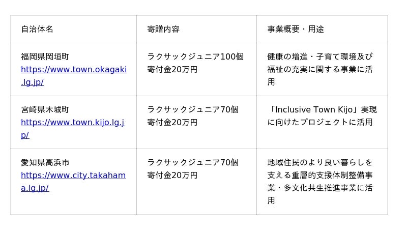 今回の寄贈は、まさにその思いを具体化したもので、子どもたちの安心・快適、さらに子育て支援に役立つ社会貢献活動として実施いたしました。布製ランドセル「ラクサックジュニア」は、これまでも様々な自治体様の子育て支援策として幅広く採用され地域社会の一助となっております。