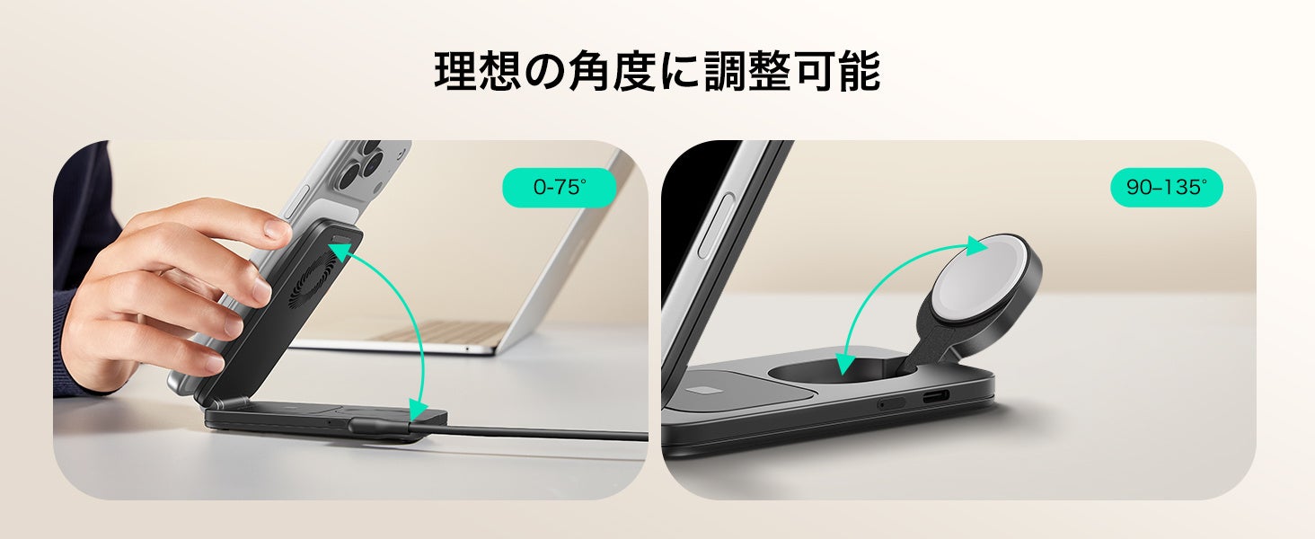 ポータブルサイズでありながら、iPhone、AirPods、Apple Watchの3つのデバイスを同時に高速充電でき、Apple WatchのOSアップデートにも対応したMFW認証を取得しています。これにより、Watchシステムの更新後でも安心して使用することができます。さらに、折りたたんで持ち運べるデザインで、最大25Wの出力を誇り、最大3つのデバイスを同時にワイヤレスで充電できるのが特徴です。